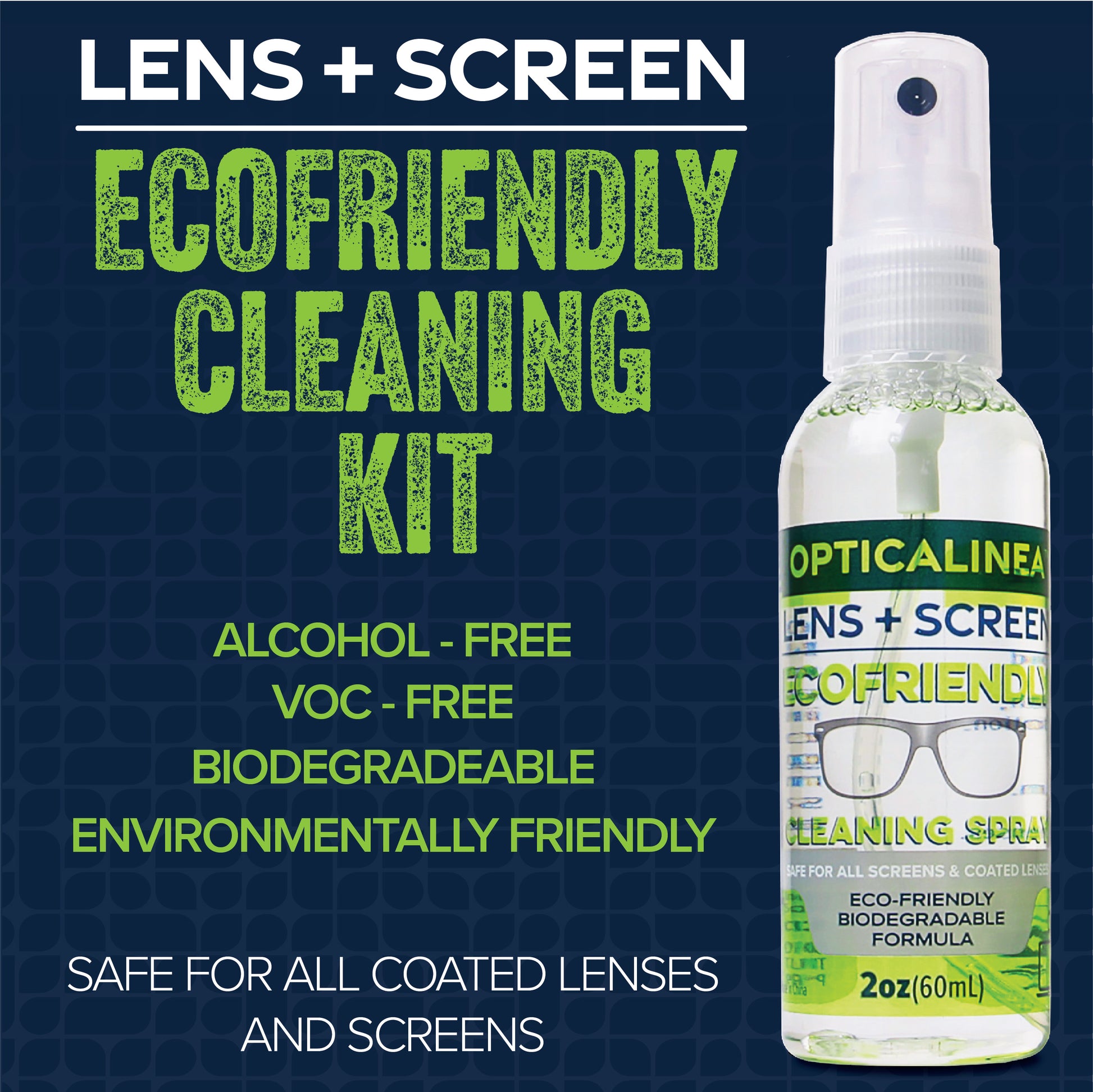 - OPTICALINEA ECOFRIENDLY LENS + SCREEN CLEANING KIT is a convenient ALCOHOL-FREE and VOC-FREE environmentally-friendly lens cleaner that provides long-lasting, fast drying, streak-free, safe and effective cleaning for all types of coated optical lenses and device screens.