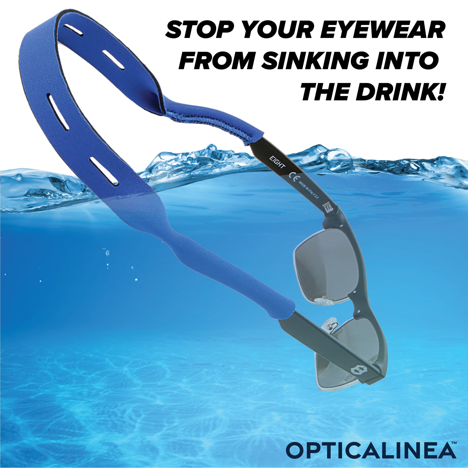 - OPTICALINEA REVERSIBLE FLOATING EYEWEAR STRAP - Reversible floating retainers have color-fast fabric on both sides with neck venting and high quality neoprene that can float up to 15g.